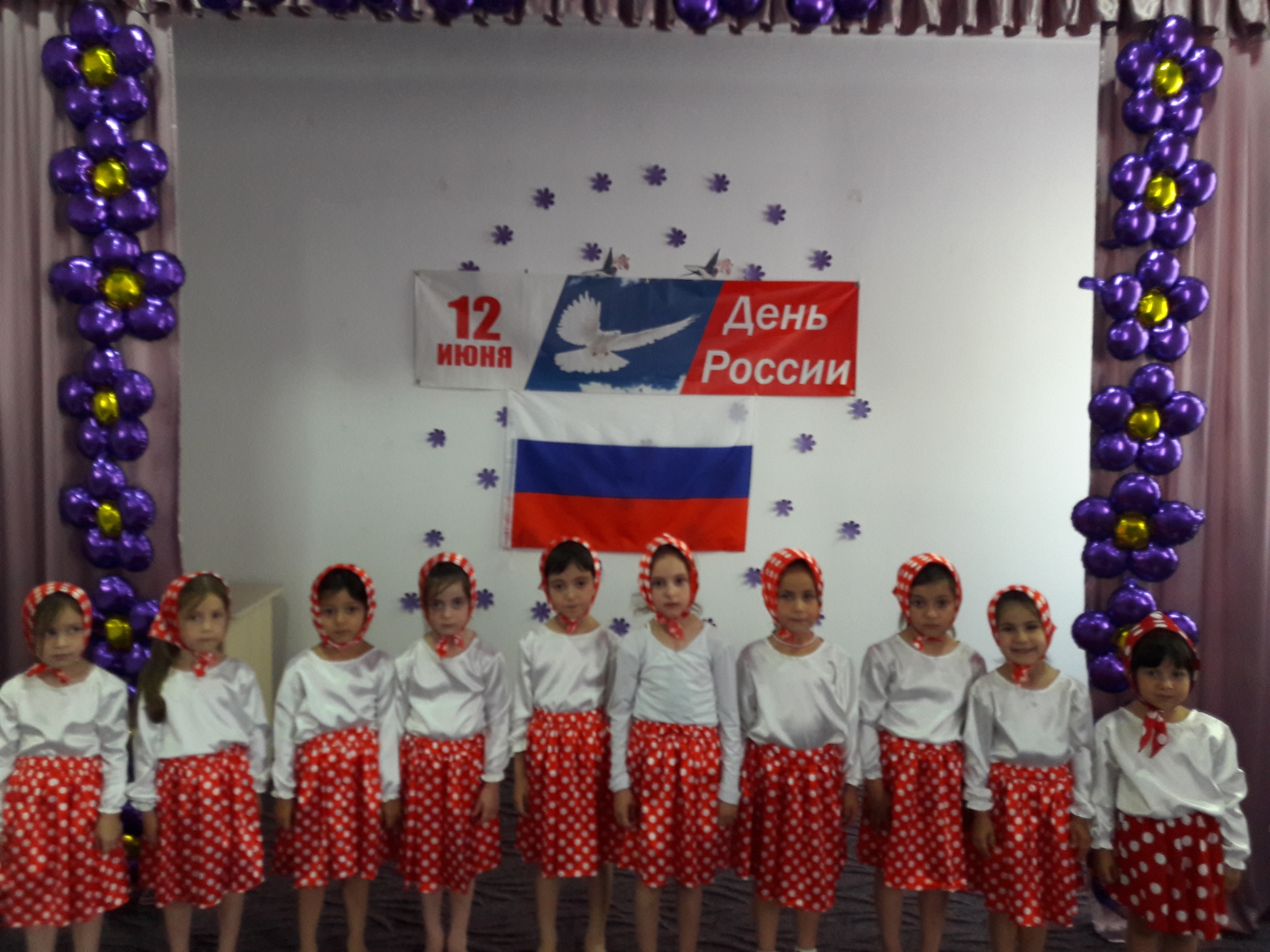 Накануне Дня России в нашем детском саду прошел праздник, посвященный этому событию. Ребята пели песни, танцевали, играли в игры, соревновались, побеждая во славу России. Также дети смотрели презентацию «Наша Россия"